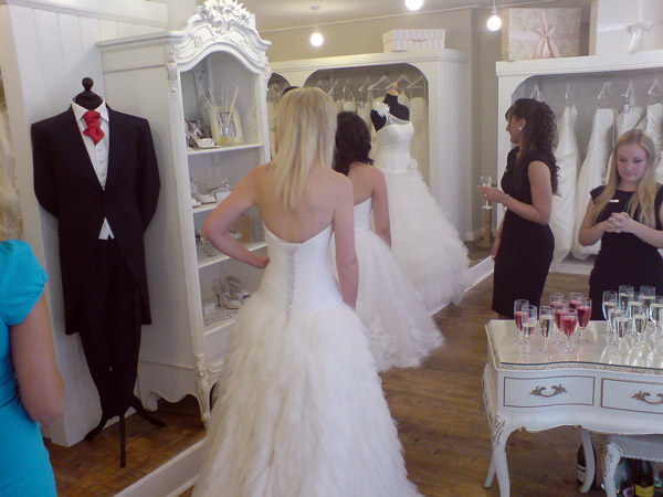 Always looking for opportunities to photograph brides and wedding paraphernalia and seek out potential clients, and not being averse to the occasional glass of champagne, I went along today to a reception to celebrate the relocation of the Pure Bridal Boutique to new premises in Lower Goat Lane, Norwich. I only had my camera phone with me, but captured a few images and some of these are included here. I’m really glad I found the time to call in, as I managed to talk to several couples planning to get married, had one or two good leads, and distributed some business cards and flyers. I also had some interesting conversations with others involved in the wedding business, includig a toastmaster and a wedding cake supplier.I’ve heard there is another new opening next week, so I will be sure to look by.